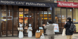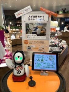 阿蘇くまもと空港の商業棟エリア「そらよかダイニング」に出店している「ロイヤルホスト熊本空港店」でも、分身ロボット「OriHime(オリヒメ)」が導入されました。店舗のエントランスでは、お客様への呼び込みを担当。また、併設されたお土産コーナーでは、商品のご紹介などの業務を行いました。地元の人気キャラクターと並んで、お客様に元気にアピールする姿が来店者の注目を集めました。(2025年9月までの期間限定導入)