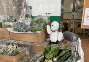 OriHime就労など IT を柱に掲げて利用者の募集を行ったところ多数の入所希望がありました。そして開所後は事業所入口にOriHimeを設置し、重度身体障がいのある方に野菜の販売をしてもらっています。