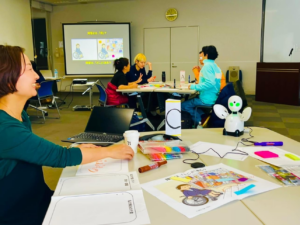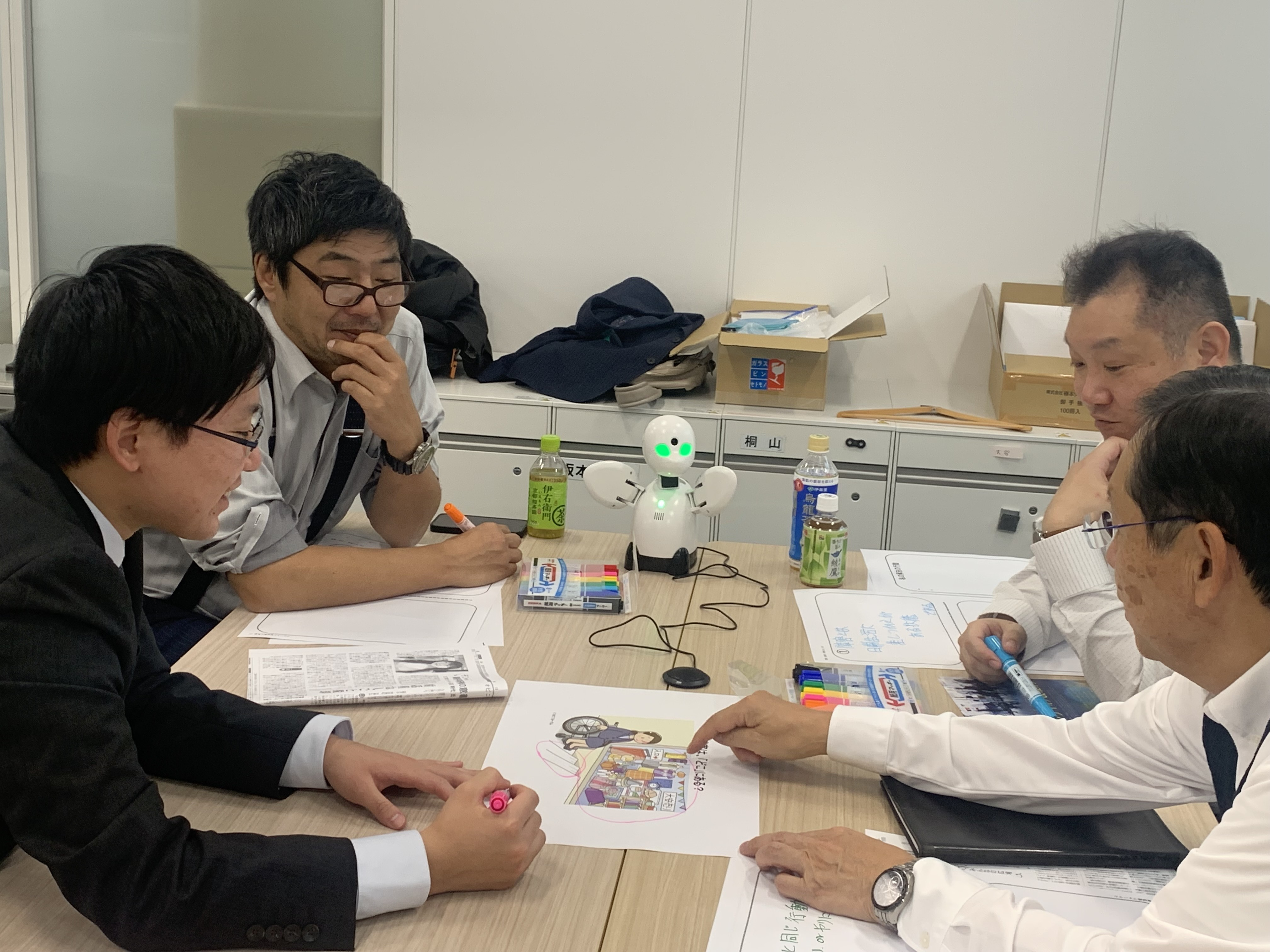 研修の際にOriHimeをグループワークのファシリテーター役として使っています。障害平等研修はグループワーク研修でテーブルに1台のOriHimeを置いて、障害当事者ならではの視点でファシリテーターをしてもらっています。この場面では精神障害があり外出が出来ない方がOriHimeを使って参加していました。