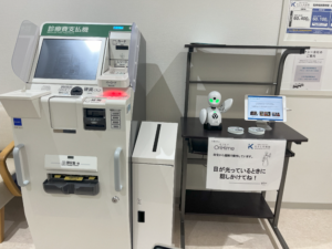 会計機横にOriHimeを、待合スペースに「動けるOriHime」OriHime‐Tを配備し、会計方法がわからない方などお困りの方のご案内を行います。